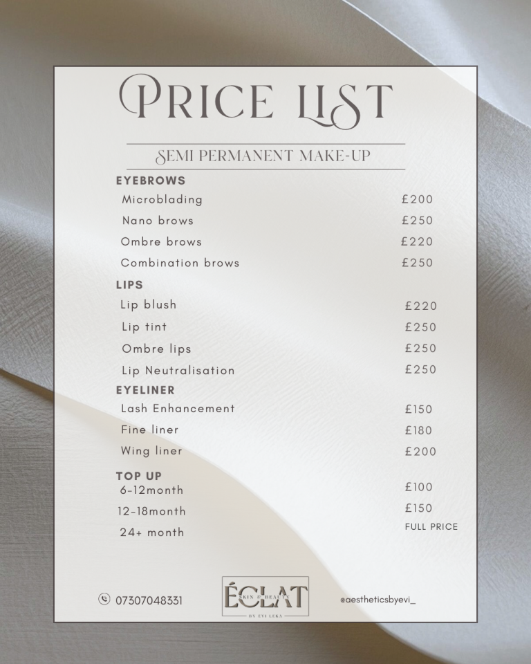 When investing in semi-permanent makeup, you're not just paying for the treatment itself you're investing in expertise, safety, and long lasting results. Our prices reflect the high level of skill, premium products, and professional standards we uphold with every client.